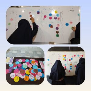 بچه های کلاس هفتم در دو گروه باهم به رقابتی نفس گیر پرداختند. از هر گروه یک نفر در ۱۵ ثانیه کارت کلمات مختلف را روی تخته نصب می کرد و با پایان یافتن این زمان، نوبت خود را به یار بعدی گروه خود می داد و به این ترتیب تمام کلمات در جای مناسب قرار گرفت. بعد از اتمام مسابقه بچه ها به تصحیح کلمات پرداختند و امتیاز خود را محاسبه کردند.